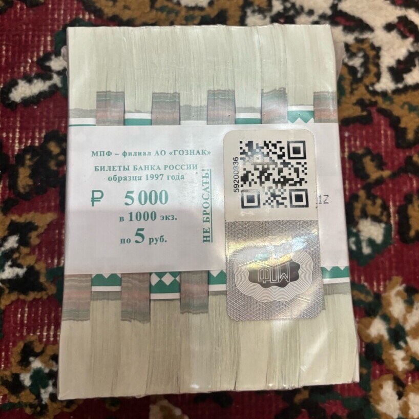 Два блока пятирублевых банкнот 2022 года. Общий номинал – 10000 рублей