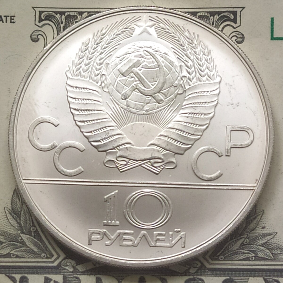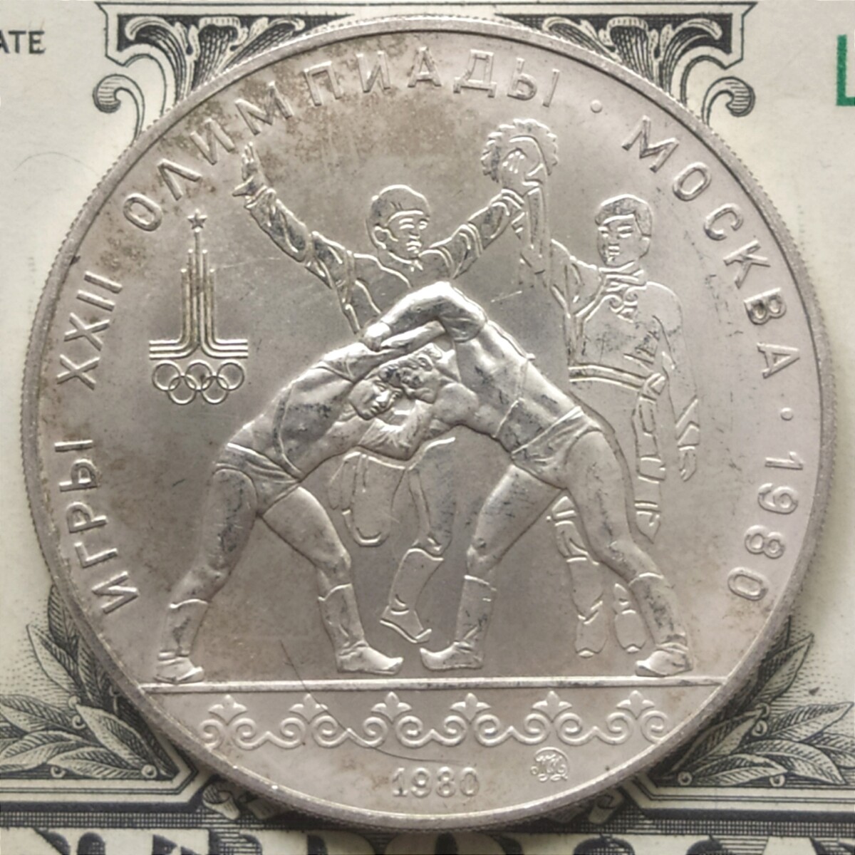 10 рублей 1980 года ММД «Борьба». Серебро 900 пробы, 30 грамм чистого металла. Состояние на фото