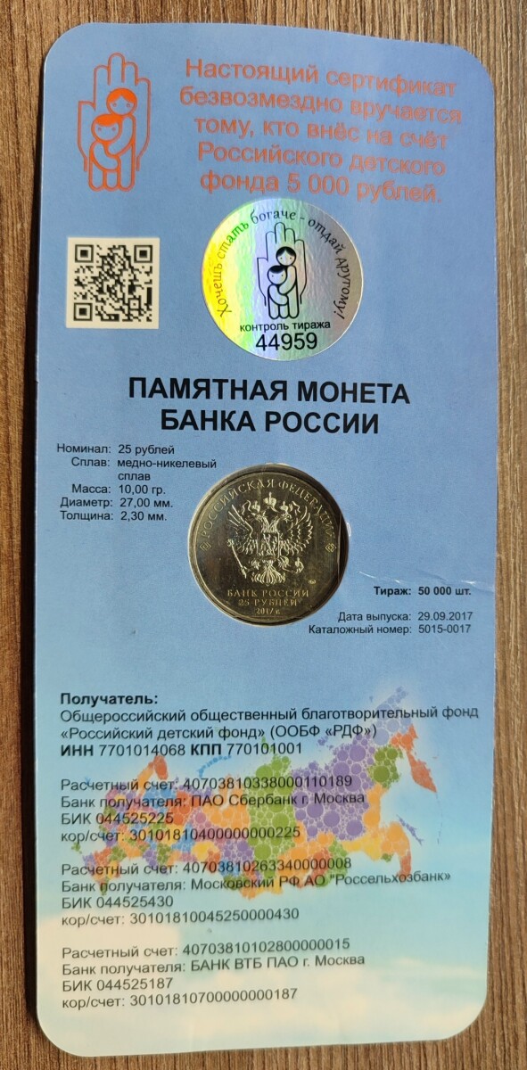 25 рублей 2017 года ММД «Дари добро детям». Номер буклета 40820. Состояние на фото