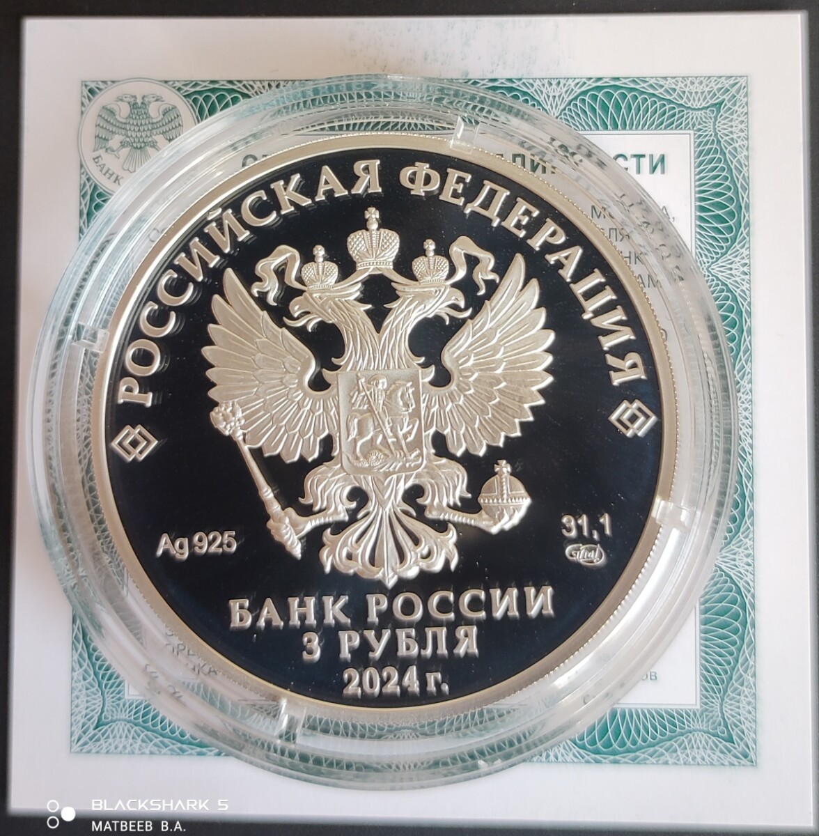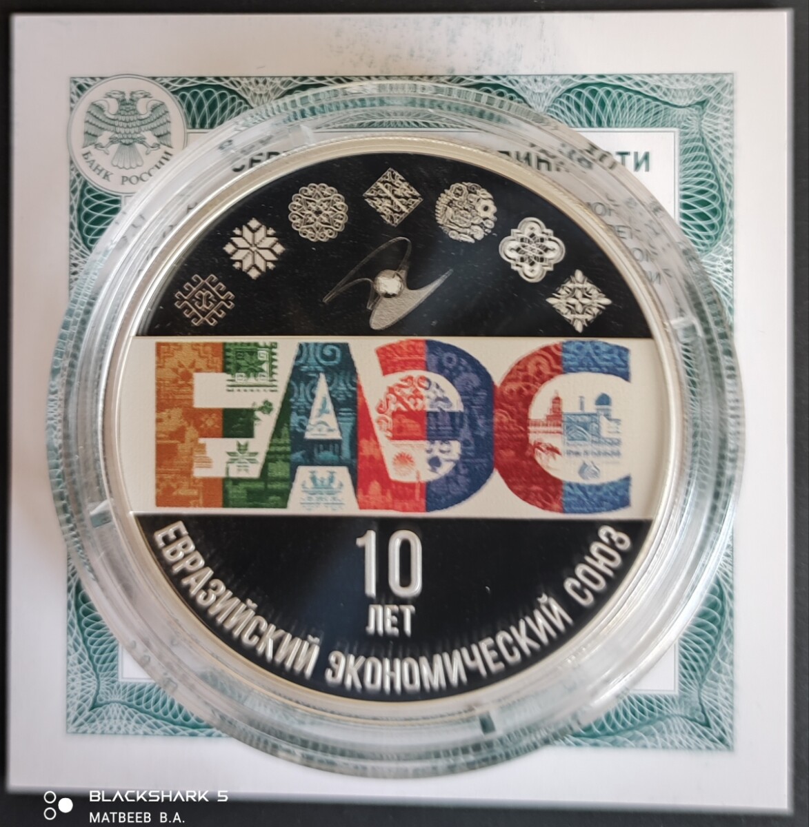3 рубля 2024 года СПМД «10-летие ЕАЭС» Proof. Серебро 925 пробы, 31.1 грамм чистого металла. Состояние на фото