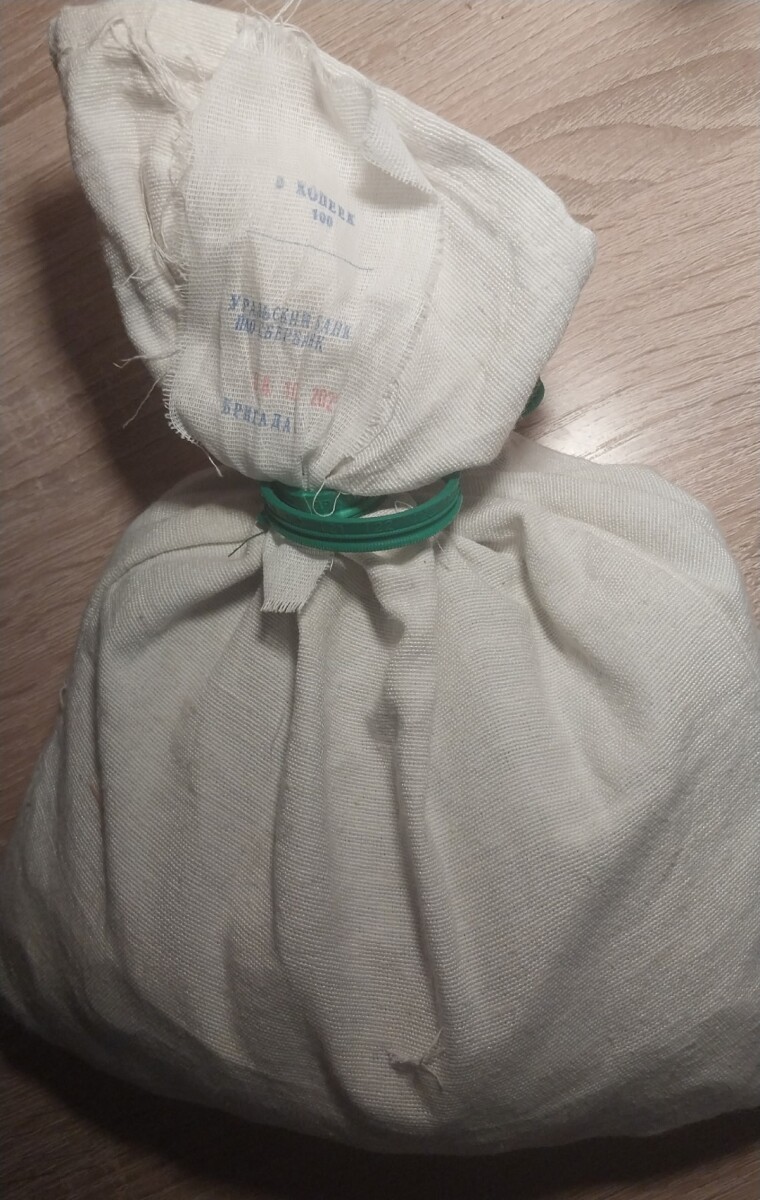 Банковский мешок с пломбой из 4000 монет номиналом 1 копейка. Общий номинал 40 рублей