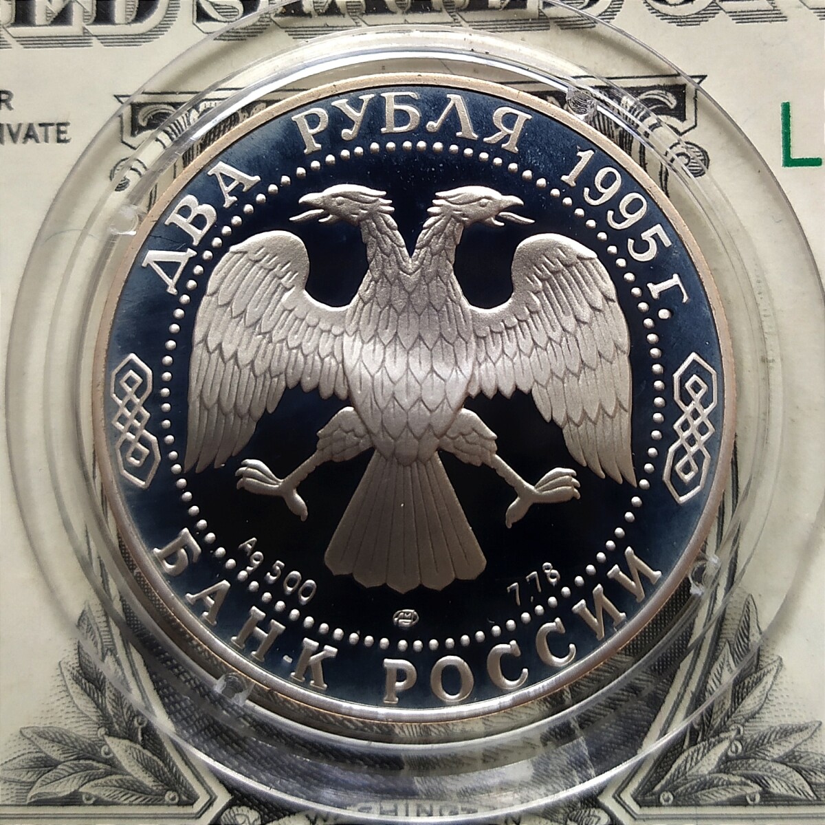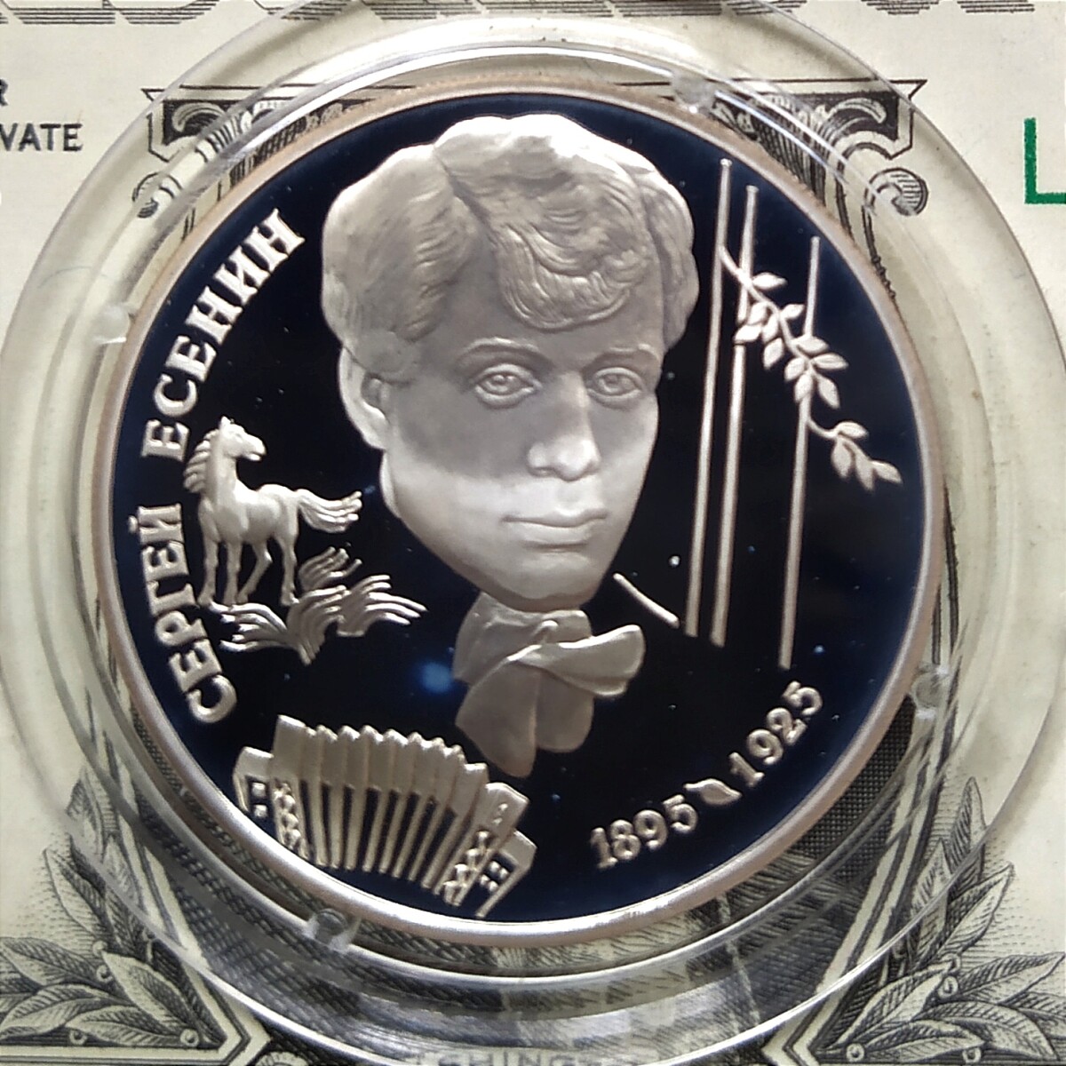 2 рубля 1995 года ЛМД «Есенин» Proof. Серебро 500 пробы, 7.78 грамм чистого металла. Состояние на фото