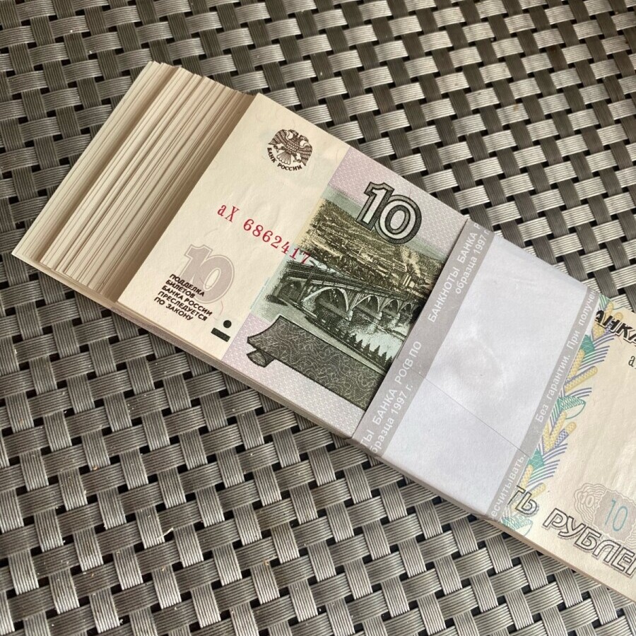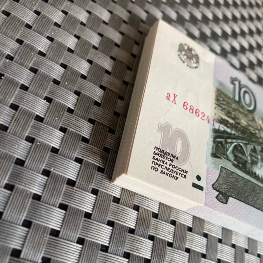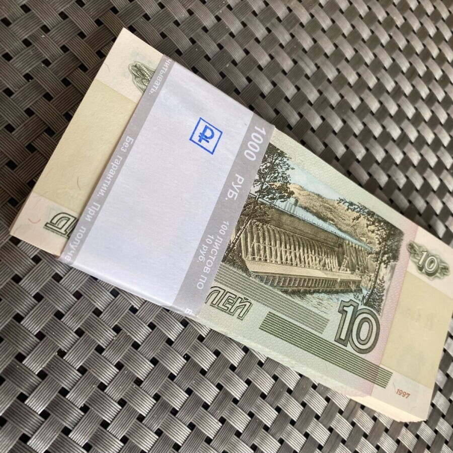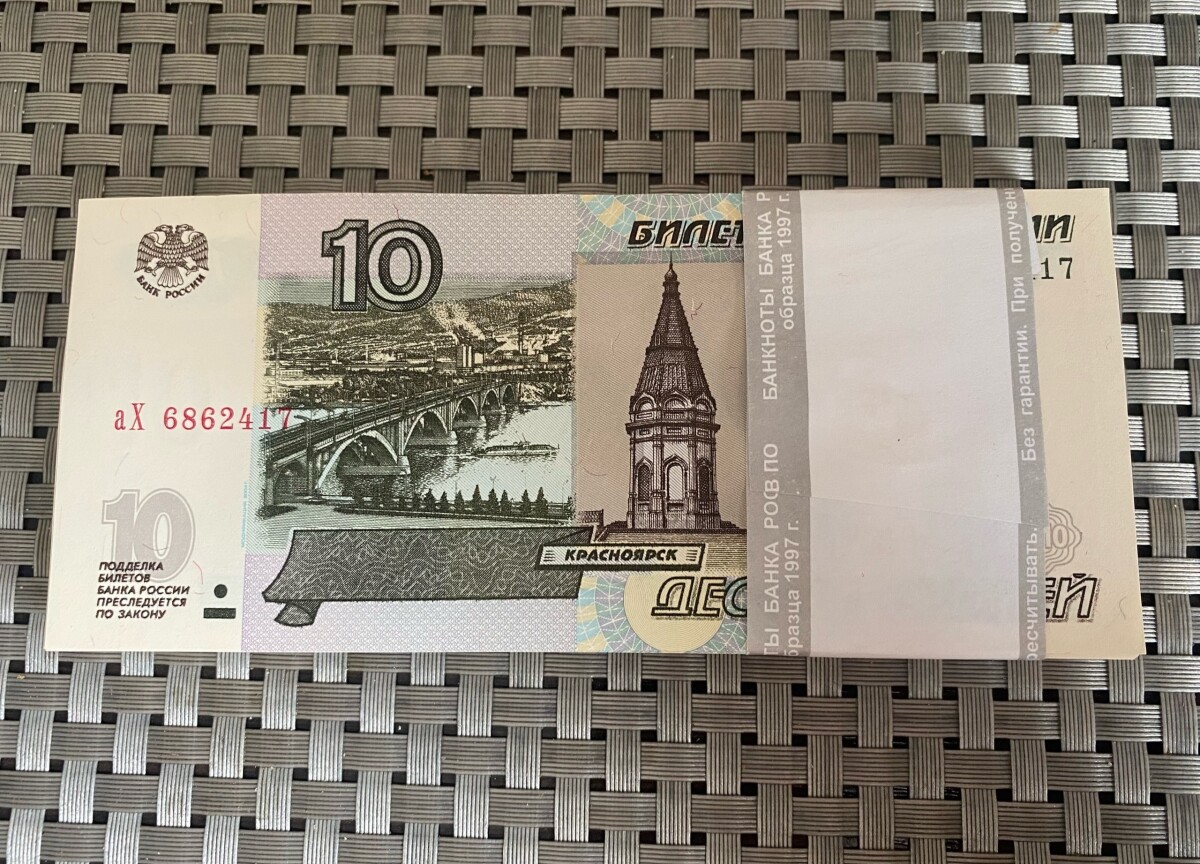 Корешок из 10 рублей 1997 года (мод. 2004 г.). Выпуск 2022 года, состояние UNC. Без мятин, порывов, грязи. В лоте 100 банкнот, общий номинал – 1000 рублей