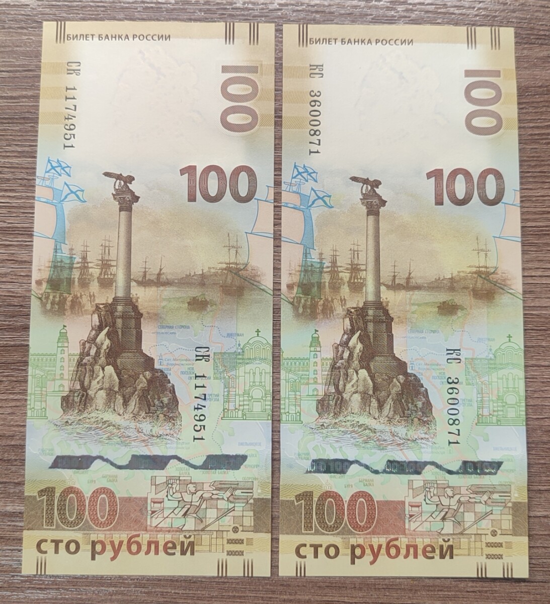 Купюры 100 руб. Фифа двух разных серий АА и АВ. Интересные окончания номеров. Состояние на фото. Именно эти купюры в лоте