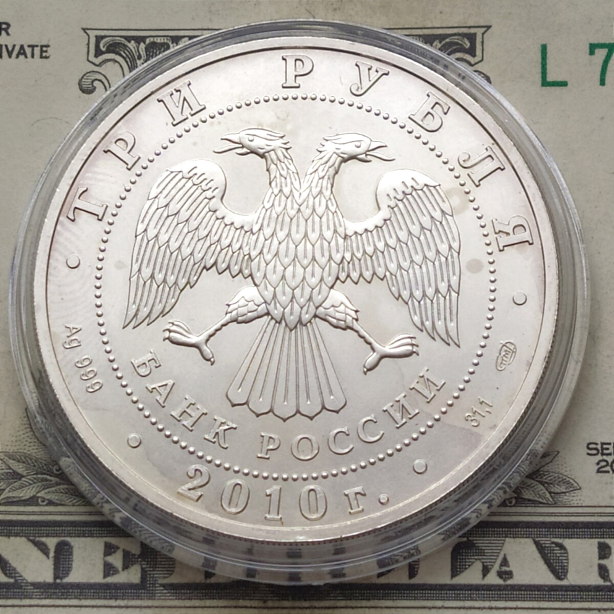 3 рубля 2010 года СПМД «Георгий Победоносец». Серебро 999 пробы, 31.1 грамм чистого металла. Состояние на фото