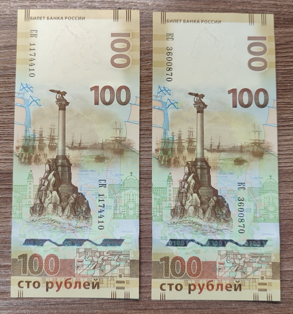 Купюры 100 руб. Фифа двух разных серий АА и АВ. Интересные окончания номеров. Состояние на фото. Именно эти купюры в лоте
